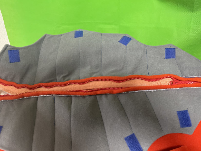 胴体は背面側にファスナーが付いている普通のタイプです。ファスナーを隠すようにマジックテープ月の背びれが左右に付いており、ファスナーを閉めた後でマジックテープも閉じることで背びれが立ちます。