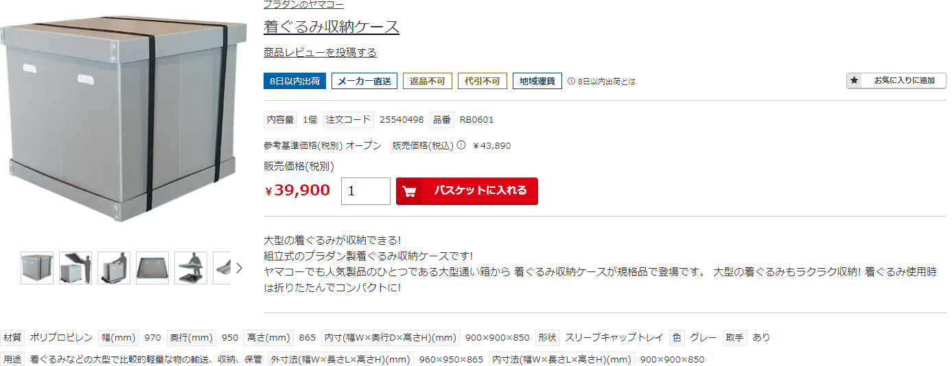 今回発注前の見積もり時に収納面積を確認したところ、「一般的な想定で60cm×4辺の合計240cmの床面積が必要となる」という回答をいただきました。