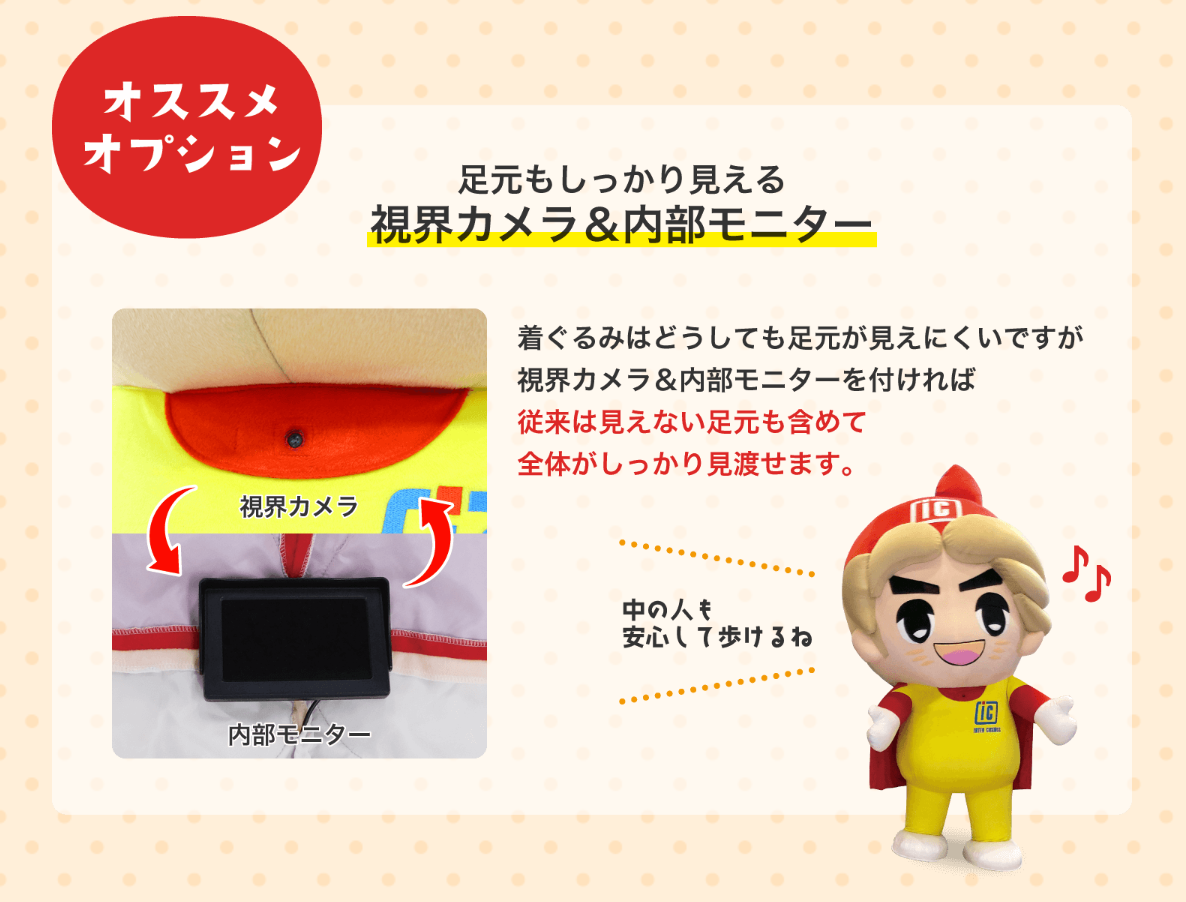 世の中には着ぐるみ内部から外の景色を見る用のカメラシステムもあるため、本格的に活動する際には改めて検討してみようと思います。