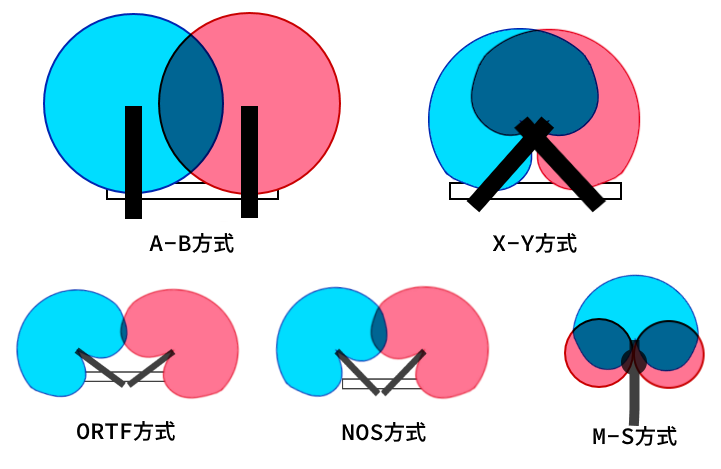 他にも、マイクをハの字に110°広げて先端同士が17cm離れるように配置するORTF方式やハの字90°で先端同士の距離が30cmで配置するNOS方式などがあります。