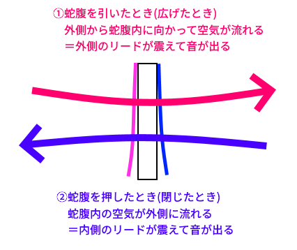 アコーディオンおよび多くの蛇腹楽器は構造として、中央の蛇腹を押した際と引いた際でそれぞれ別のリードが鳴るように取り付けられています。