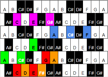 この法則は段を移動しても変わらず、緑色で示すようにA-C#-EのA Majorなどすべての調に対して当てはめることができます。