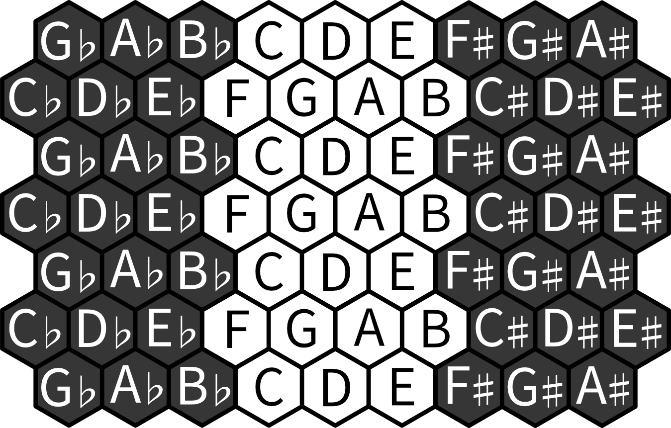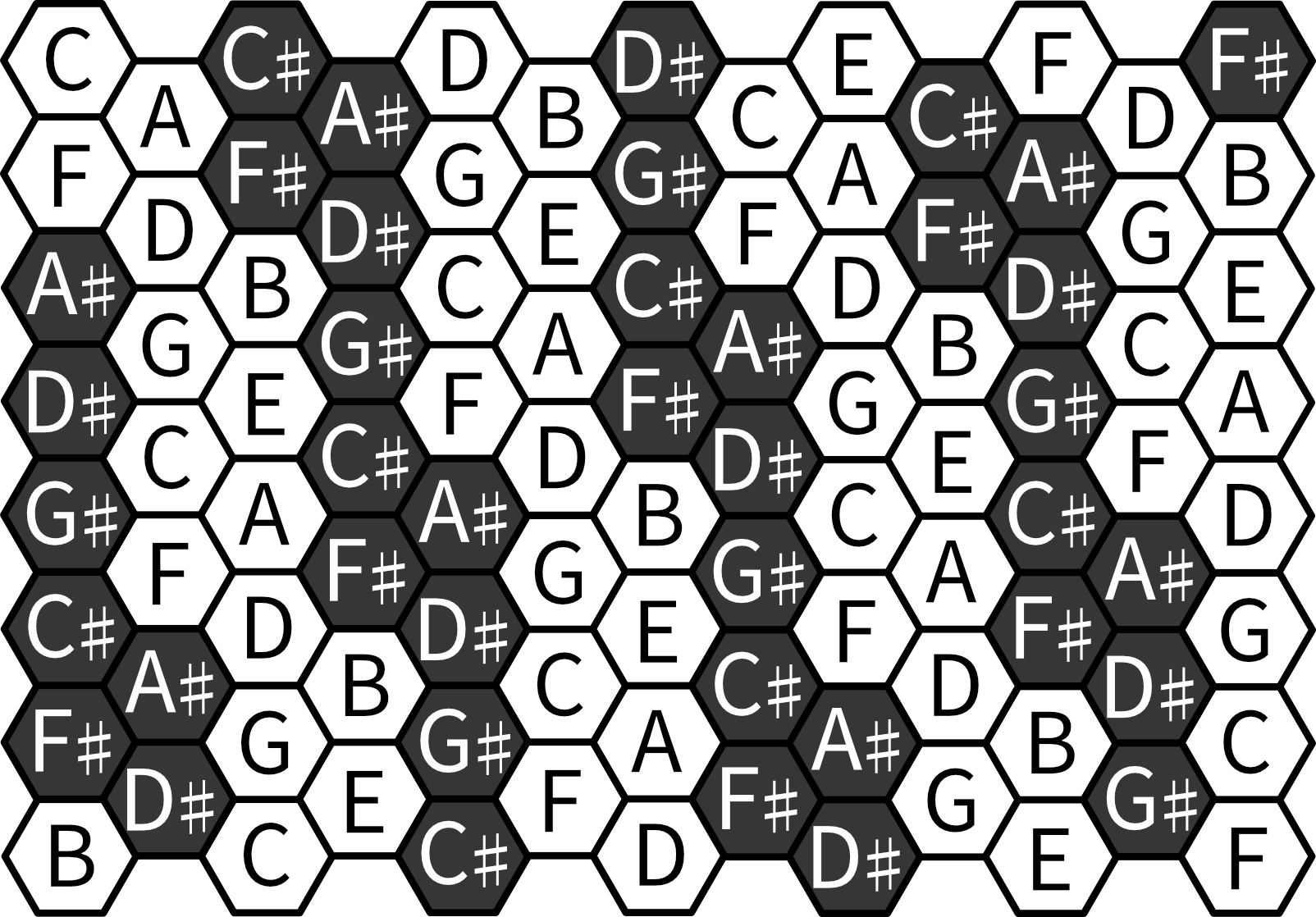 そして下から2, 4, 6列目は残りの音による全音階で、C# → D# → F → G → A → B → C# → ... と並んでいます。