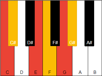 例として、単純なメジャーコードを鳴らす際にも、Cメジャー(下図の赤い鍵盤)から半音上げてC#メジャー(下図の黄色)にするだけで白鍵と黒鍵の比率や位置が大きく変わってしまいます。