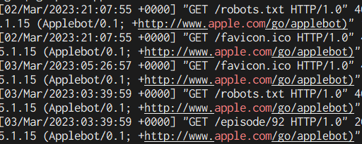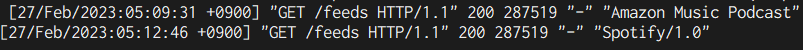Amazon Music PodcastやSpotifyはクローラーにより10分に1回程度のスパンで見に来ているようです。