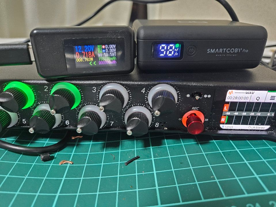 完成後USB-Cの電流電圧チェッカーにて確認したところ12Vが正しく出ており、2系統のファンタム電源を同時に使用した際に約0.7Aが流れていました。