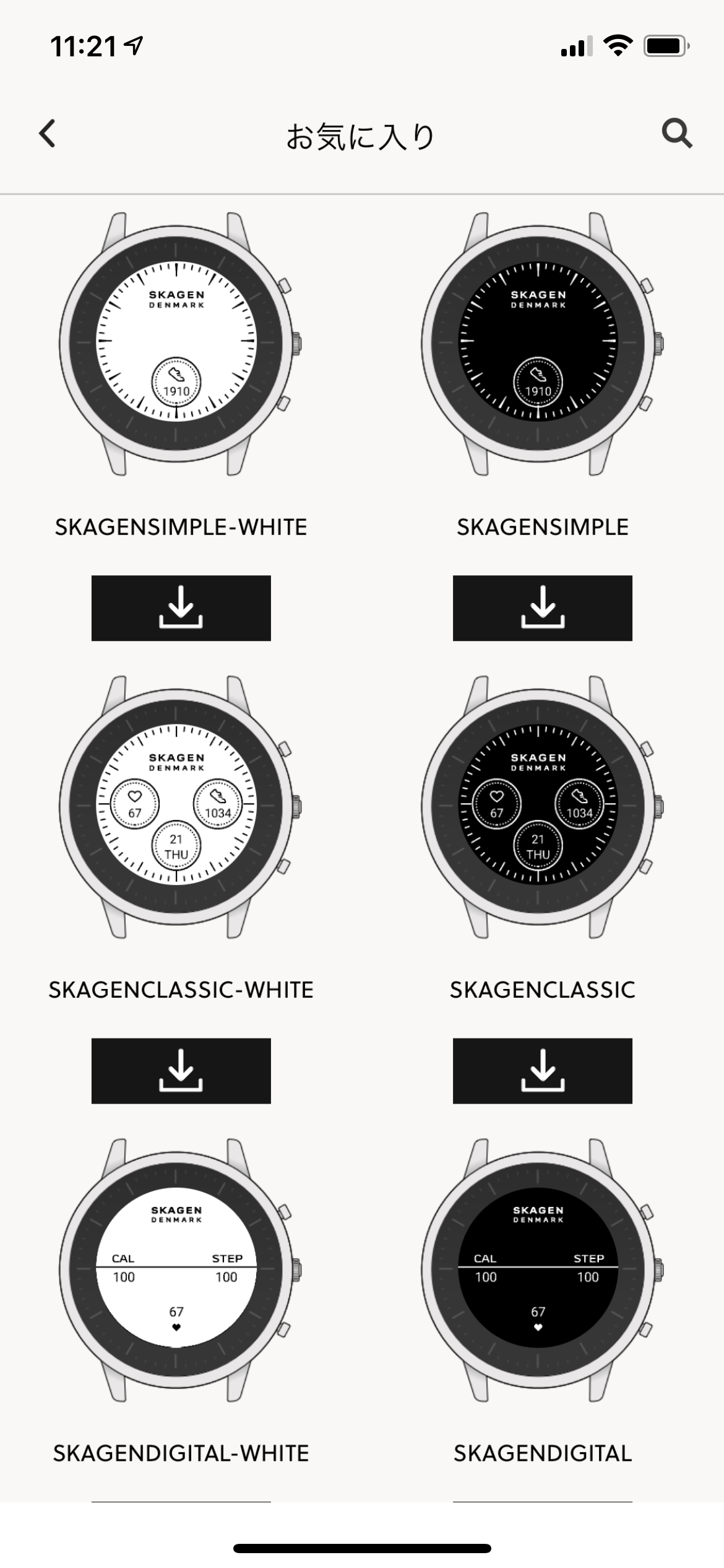 サイト等を見る限りではFossilの方では1ページに収まらないほどのスキンが用意されているっぽいのですが、現状SKAGENの方では6種類ぐらいしか出てきませんでした。